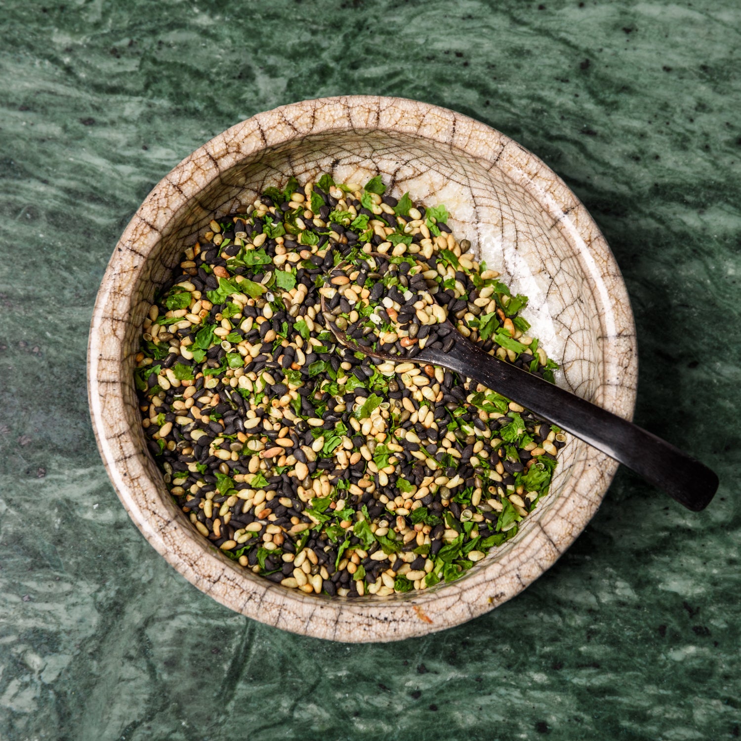A fresh and crunchy salad where the umami-rich flavors of Ponzu with yuzu and koji are lifted by fresh mint and crispy furikake. For an extra Asian touch and a little more zing – add finely chopped ginger. Good with everything!